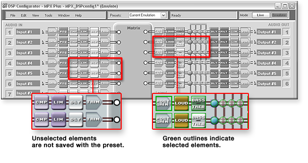 You can save a preset in either Emulate mode or Live mode. Saving a preset in Emulate mode stores the preset in the file that is currently open. This file must then be saved to disk (recommended), pushed to the device after a connection is established, or both. In Live mode, the preset is saved directly to the device. First, create a configuration from which you want to save a preset. In Emulate mode, you are working from the current emulation. In Live mode, you are working from the current state of the device. To build a preset, you must first select the elements to be saved. To select elements in DSP Configurator that are to be saved as a preset, use one of the following methods: