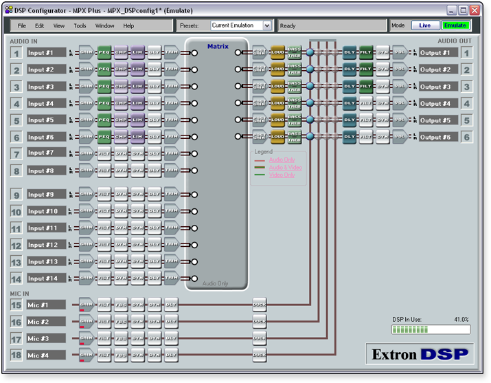 Audio & Video I/O WorkspaceDSP Configurator defaults to the Audio & Video I/O workspace when the application launches. To open this workspace from another workspace, you can select Audio & Video I/O from the View menu or press <F2> on your keyboard. Alternatively, you can click Audio & Video I/O in the Legend section of the workspace you are viewing. In the Audio & Video I/O workspace, you can access the audio and video switching matrix and all audio gain, trim, and volume controls. You can also access all audio DSP signal processors. See the Switcher Matrix Operation section