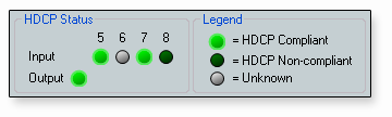 HDCP ComplianceThe Audio & Video I/O workspace and the Video I/O workspace show an HDCP status indicator section. HDCP status is derived from the digital input signal or digital output signal. The MLS 608 checks for output HDCP compliance only when the selected input source is encrypted. When the source is encrypted, the firmware authenticates the output, checking whether the sink device (for example, a display) is HDCP compliant or non-compliant. If the connected display is not HDCP compliant, the MLS 608 mutes the output. When the selected input does not have a source connected or if the signal is not encrypted, the output HDCP status is given as "unknown." Furthermore, when no source is connected on the selected input, the TMDS lines on the Tx (output) are turned off, so HDCP encryption status is lost for the output and all the inputs. Then, the HDCP status is given as unknown. When the MLS is currently on an active and encrypted digital input, the HDCP status indicators in the software indicate the status on all digital inputs and output. If the input is then switched to any analog input, the switcher mutes its digital output in favor of the analog input. However, because only digital video is muted, the TMDS lines are not turned off, and so the HDCP status indicators remain on. The HDCP Status section of the workspace is enabled while in Live mode and displays the following details: