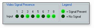 Video Signal PresenceThe Audio & Video I/O workspace and the Video I/O workspace show a Video Signal Presence indicator section. This section of the workspace is enabled while in Live mode and displays the following details: