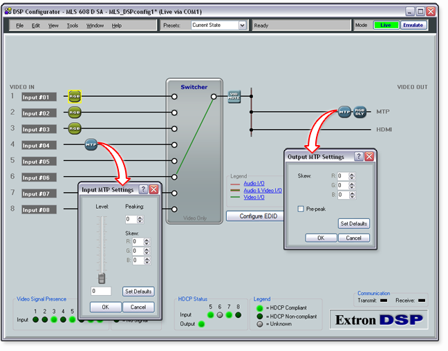 You can adjust video settings for the MLS 608 D Series in the Video I/O workspace. To open this workspace, select Video I/O from the View menu, press <F4>, or click Video I/O in the Legend section of another workspace. See the Workspaces Overview section and the Switcher Operation section for more information. |